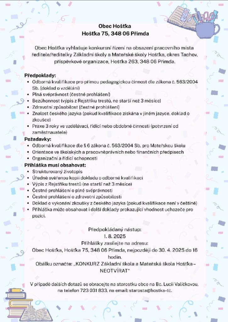 Obec Hoštka vyhlašuje konkurs na obsazení pozice ředitele/ředitelky Základní školy a Mateřské školy. Uchazeči musí mít odbornou kvalifikaci, plnou svéprávnost a bezúhonnost. Přihlášky je nutné zaslat do konce dubna 2025. Pro více informací kontaktujte starostku obce.