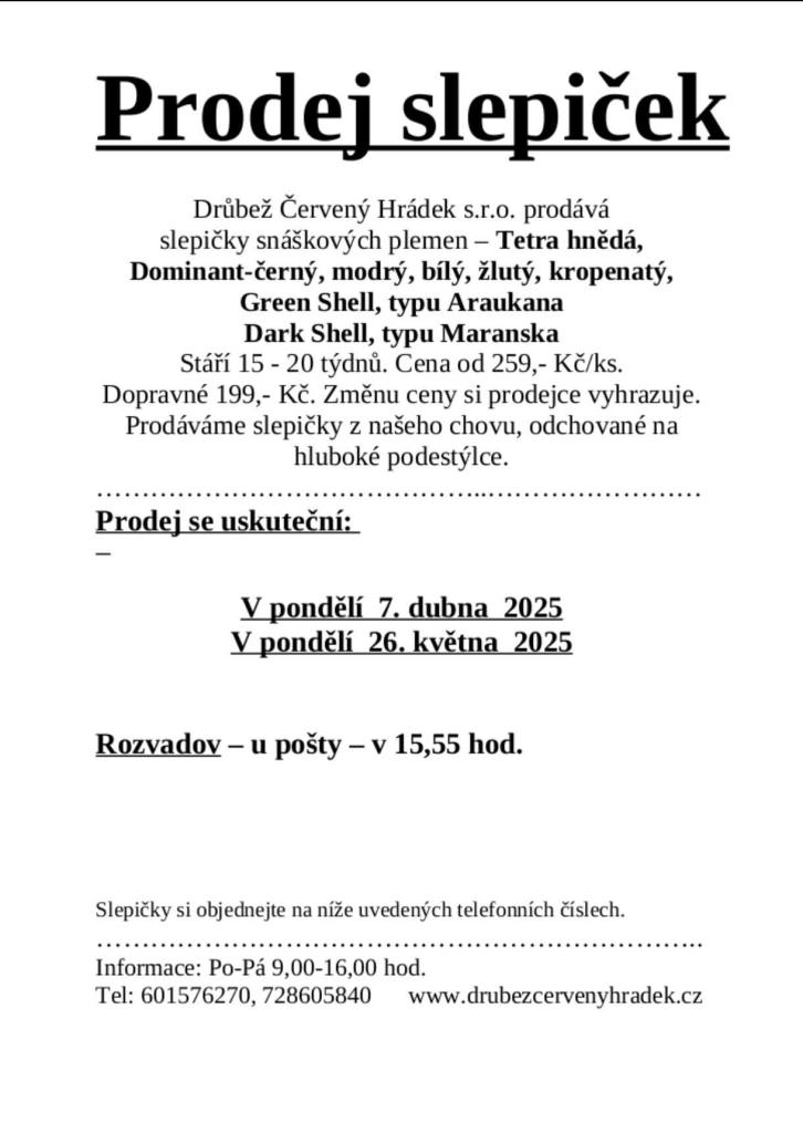 Drůbež Červený Hrádek s.r.o. prodává slepičky snáškových plemen v období od 7. dubna do 26. května 2025. Slepičky jsou ve stáří 15-20 týdnů a cena začíná na 259 Kč za kus. Prodej se uskuteční u pošty v Rozvadově v 15:55 hodin. Zájemci mohou objednávat na uvedených telefonních číslech.